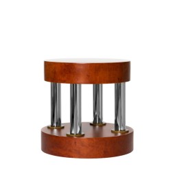 Low wooden coffee table covered with natural wood essence, chromed metal elements.