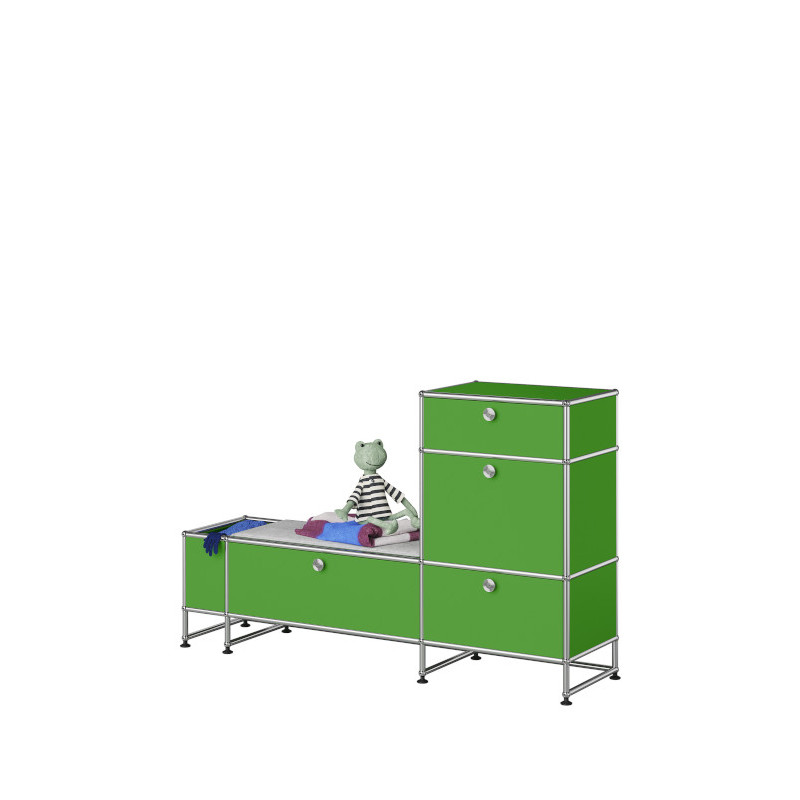 Designed to accompany children's daily routines, this USM Haller storage unit for kids combines practicality and elegance with remarkable simplicity. Its clever structure offers both closed compartments, to hide toys or clothes, and an open storage bin ideal for stuffed animals, favorite books or small accessories. A reliable companion for creating an organized yet playful environment.