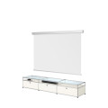 With its two drop-down doors, storage becomes effortless, allowing every item to find its place, whether digital accessories, small devices or daily essentials. The sliding drawer adds a dedicated area for arranging items that need to remain within reach while preserving the purity of the overall silhouette. A cable grommet keeps the setup impeccably organized, ensuring a pleasant and balanced audiovisual environment.