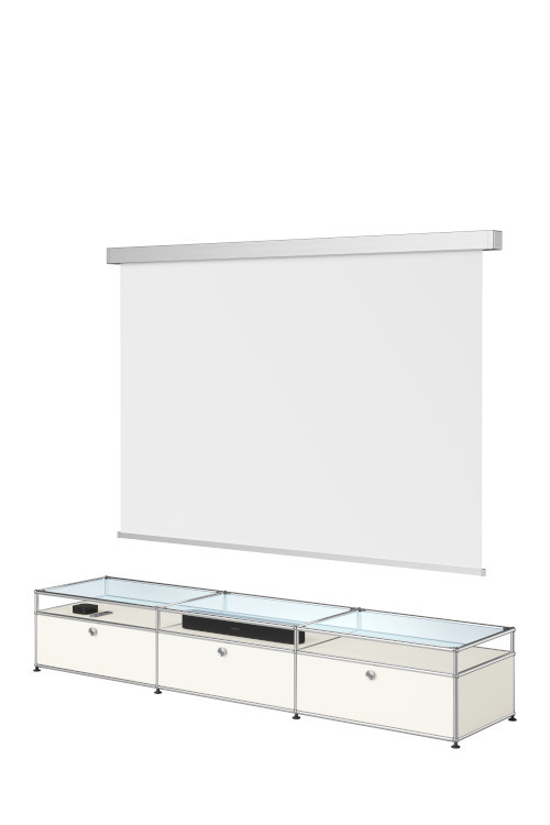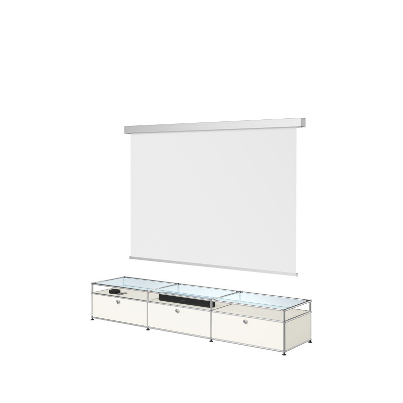 Refined and practical, this USM Haller media unit fits seamlessly into a thoughtfully designed interior. Its elongated profile, supported by a structure of chrome-plated steel tubes combined with thermocoated metal panels, introduces a contemporary character that enhances the wall space as much as the objects placed nearby. One can easily imagine a large screen or an artwork above it, as if the unit were defining a calm and inviting setting for shared experiences.