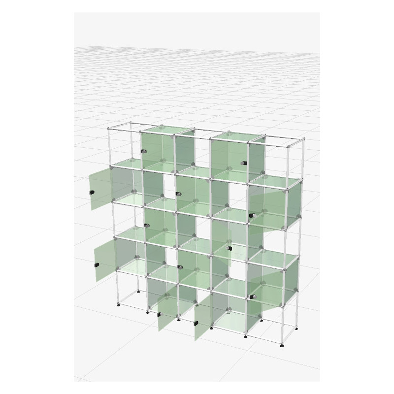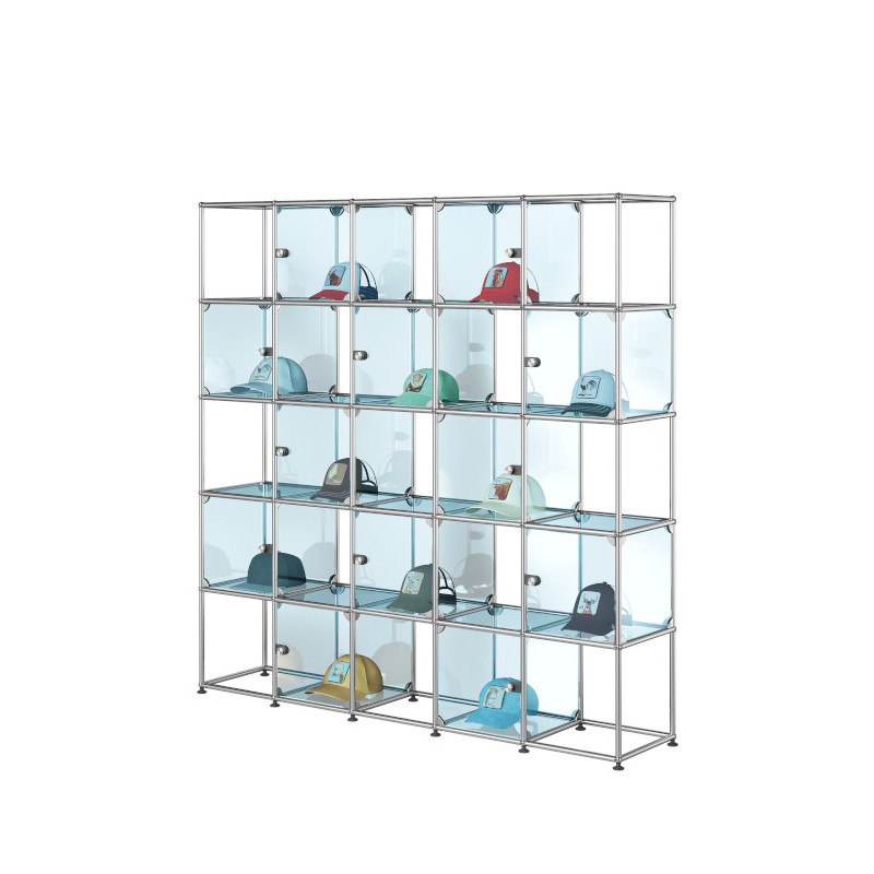 For those who take pleasure in displaying, organizing and sharing a collection, this large USM Haller display cabinet is an ideal solution for any type of interior. Spanning five levels and five columns, this architectural composition alternates between open and closed volumes that respond to one another with precision. The eye moves freely across the structure, inviting discovery from carefully chosen angles, without visual overload or a static showcase effect.
