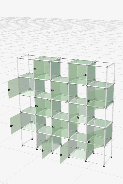 Glass plays a central role here. Transparent and precise, it allows light to pass through the structure and highlight the displayed forms. Rare books, design pieces, selected memories or valuable archives find a setting that enhances their presence without ever overpowering it. The open modules ensure easy access and encourage a constantly evolving display, while the 12 glass-front compartments protect a curated selection while keeping it visible. This variation creates a subtle dialogue between intimacy and sharing.