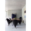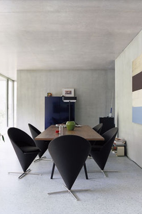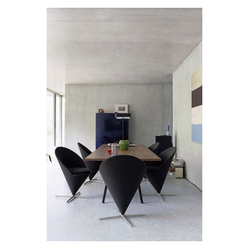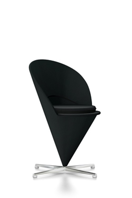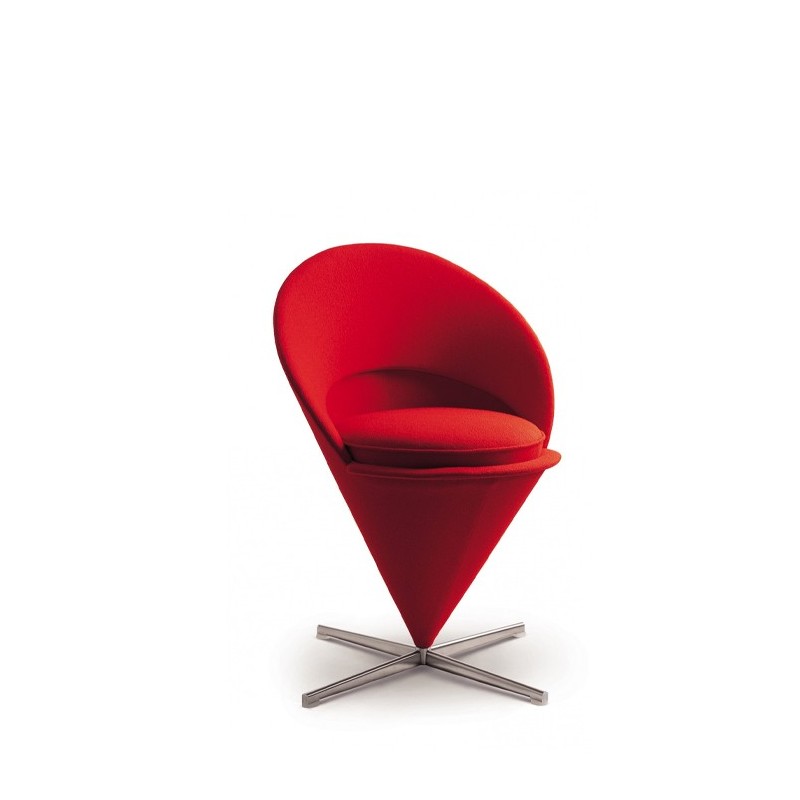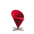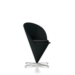 • Originally designed for a Danish restaurant, the Cone Chair takes its shape from the classic geometric figure for which it is named. The cone-shaped seat is mounted at its point on a stainless steel swivel base. A semi-circular padded shell extends upward to form the back and armrests, thereby creating a very comfortable armchair. The matching Cone Stool is an ideal companion for the Cone Chair as well as the Cone Table, yet it also makes a striking solo piece.