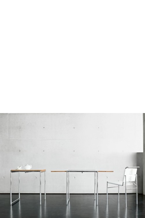 La table Jean, qui doit son nom au compagnon de longue date d'Eileen Gray, l'architecte Jean Badovici, était une pièce phare de leur villa d'été E 1027. "Chaque pièce a l'une de ces tables" disait-elle ; "elle sert à la fois de bureau ; pour recevoir, on peut les approcher et les étendre, et l'on a une petite table à dîner, discrète mais résolument stable". Il n'est pas nécessaire d'ajouter quoi que ce soit.