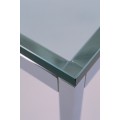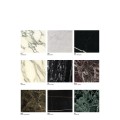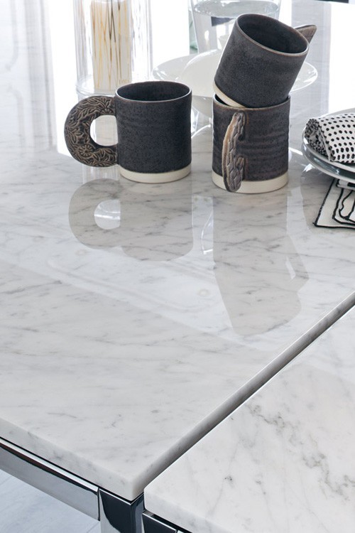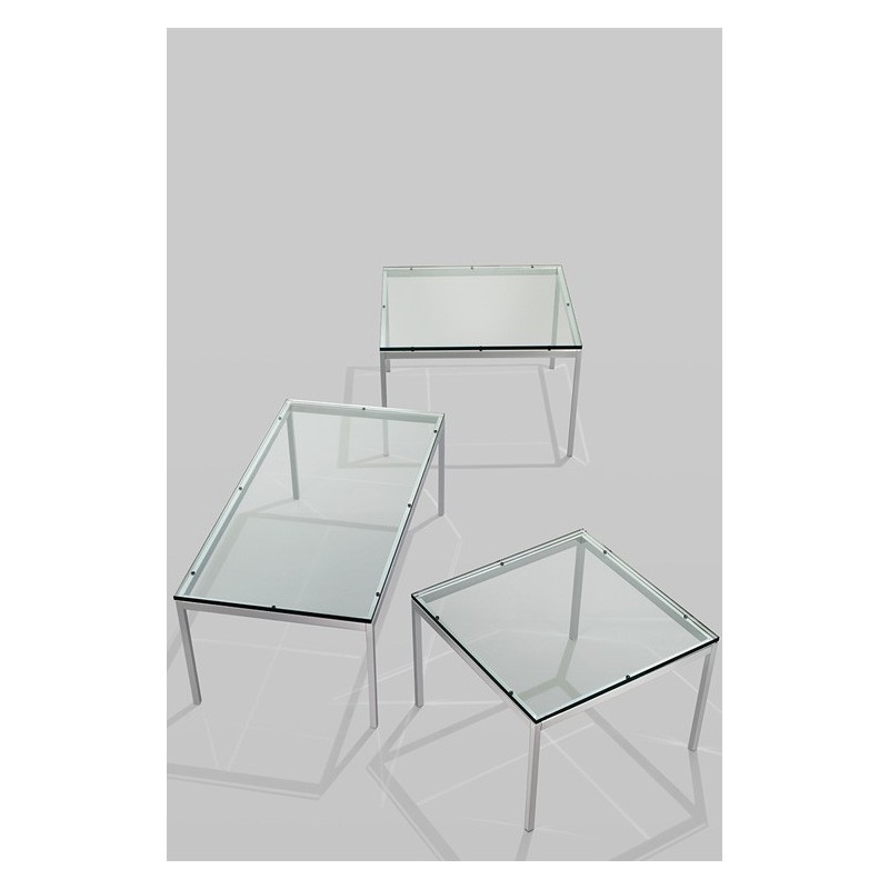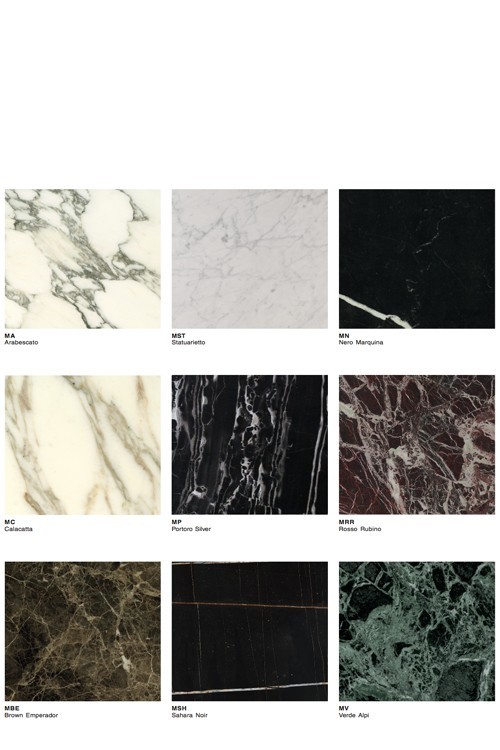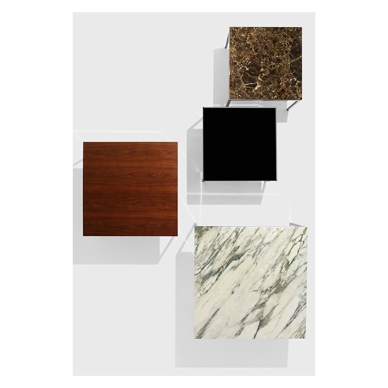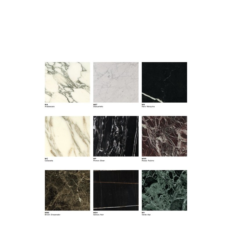 Les structures en acier poli ou chromé, peuvent être rectangulaires ou carrées, le plateau peut être en plusieurs choix de marbre ou en verre transparent. Les plateaux de marbres ont une finition transparente polyester pour aider à prévenir des tâches d'usage.