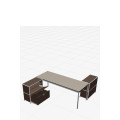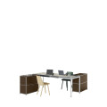 Chaque poste bénéficie de zones de rangement afin d'assurer un espace organisé tout au long de la journée. La porte abattante et le tiroir coulissant présents sur chacun des meubles offrent un accès fluide aux documents et objets essentiels, favorisant une concentration optimale sans surcharge visuelle. Le généreux plateau central permet de travailler face à face tout en laissant suffisamment de place pour disposer ordinateurs, dossiers et accessoires de bureau.