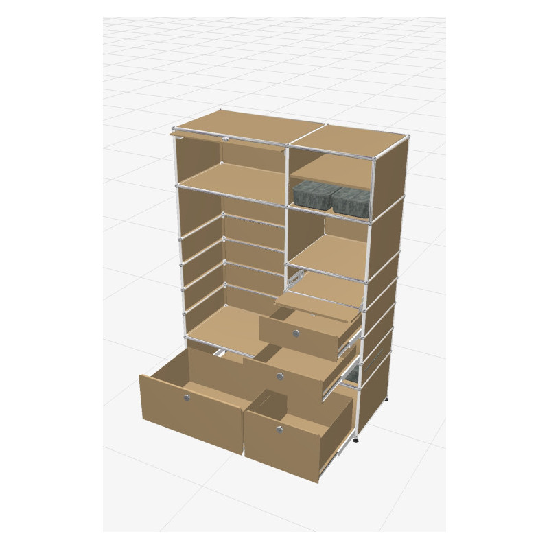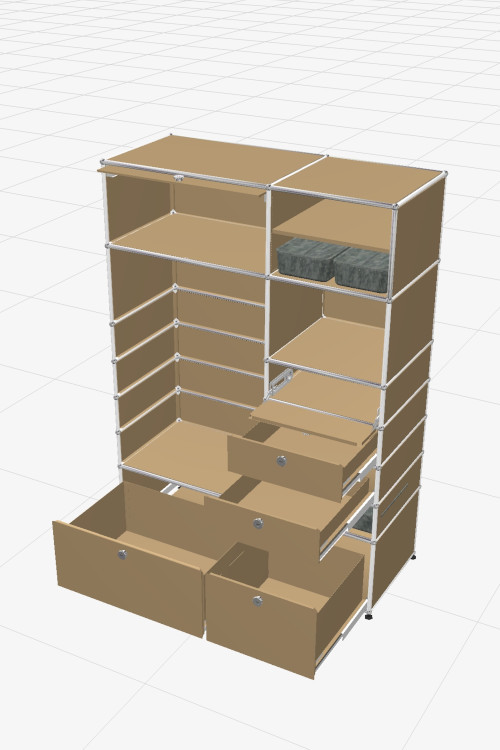 Elle se compose ainsi de deux portes abattantes, de quatre tiroirs coulissants et d'une tringle à vêtements, offrant une organisation pratique et fluide. Un des modules ouverts intègre une tablette intermédiaire, détail discret mais utile pour hiérarchiser les usages et optimiser le volume. L'ajout de boîtes Inos USM est une solution supplémentaire envisageable pour affiner le rangement et protéger certains essentiels.