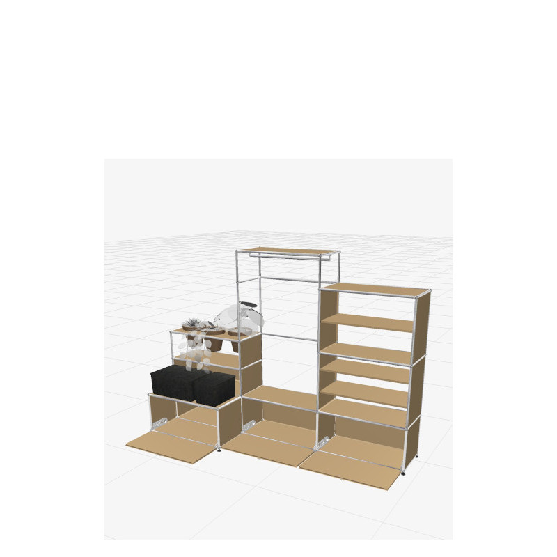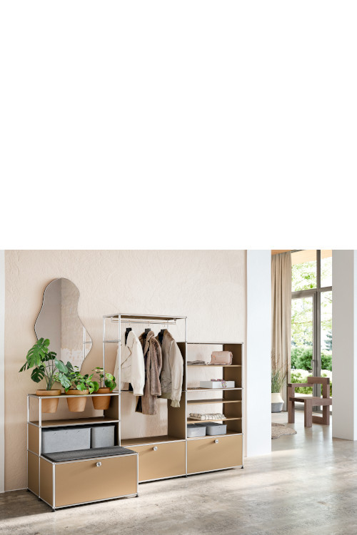 Trois portes abattantes composent une façade nette et équilibrée, idéale pour dissimuler chaussures et accessoires avec classe. Deux modules ouverts accueillent des tablettes aux traits fins, parfaites pour organiser les essentiels et glisser des boîtes Inos USM. L'assise intégrée joue un rôle important dans la composition. Elle offre un appui pour se chausser, déposer un sac ou marquer une brève pause. Cela transforme l'entrée en un espace pratique et structuré, pensé pour le confort d'usage.