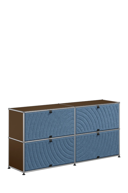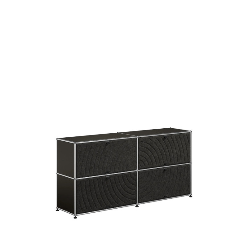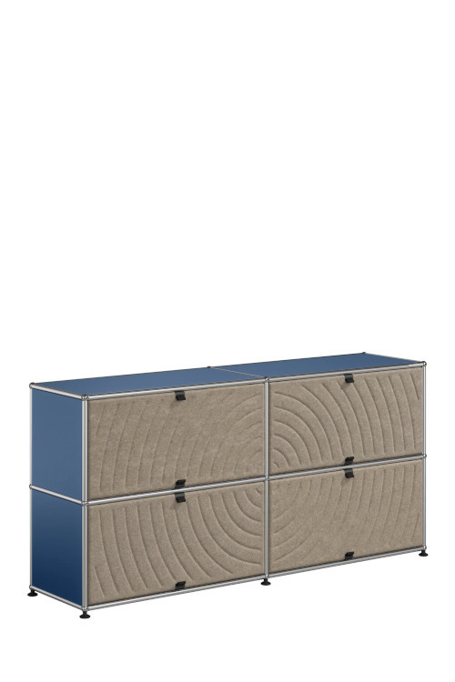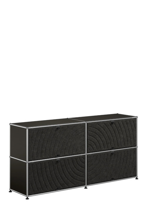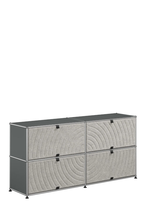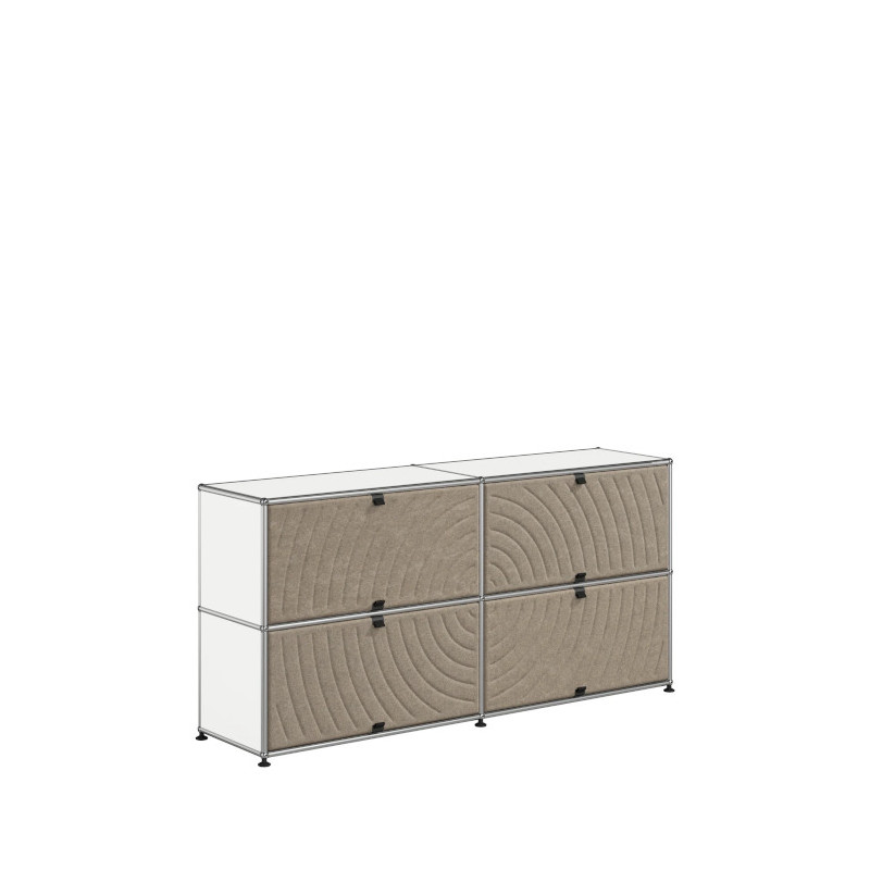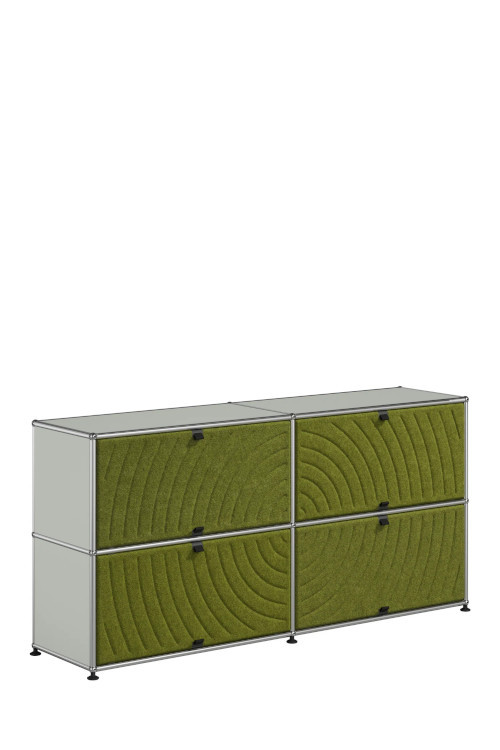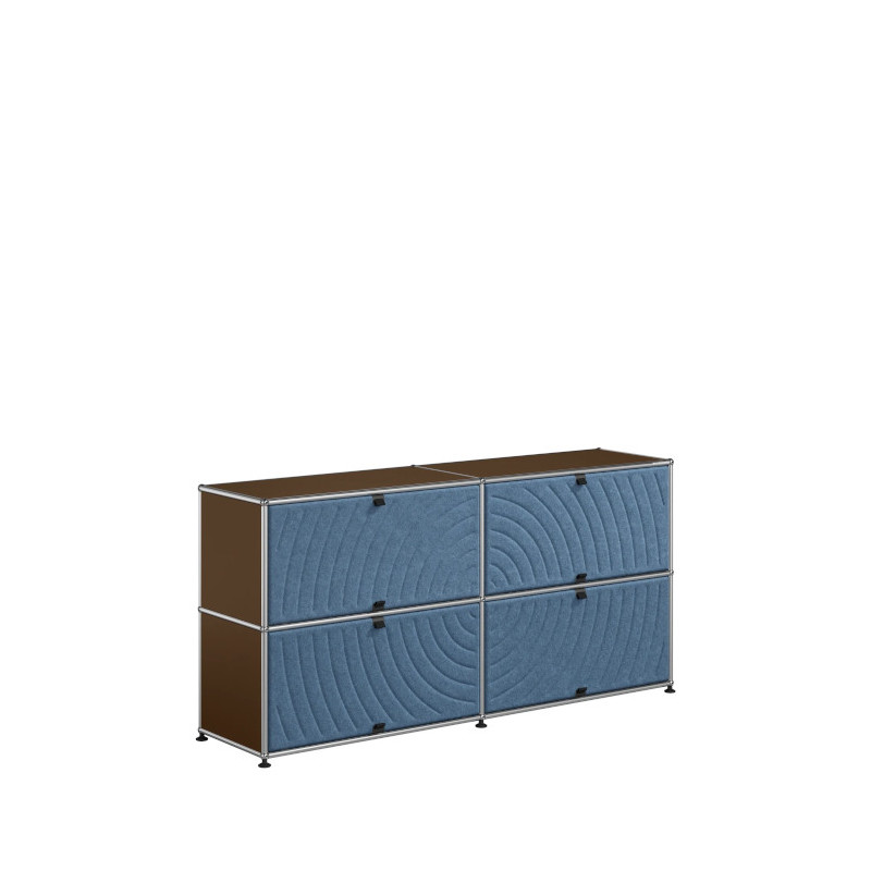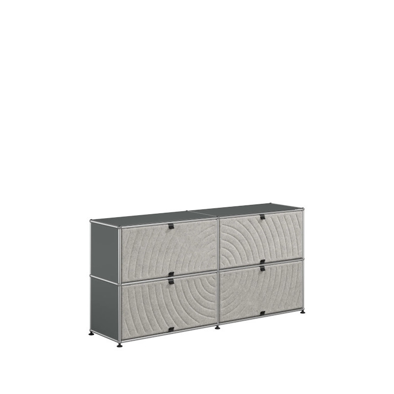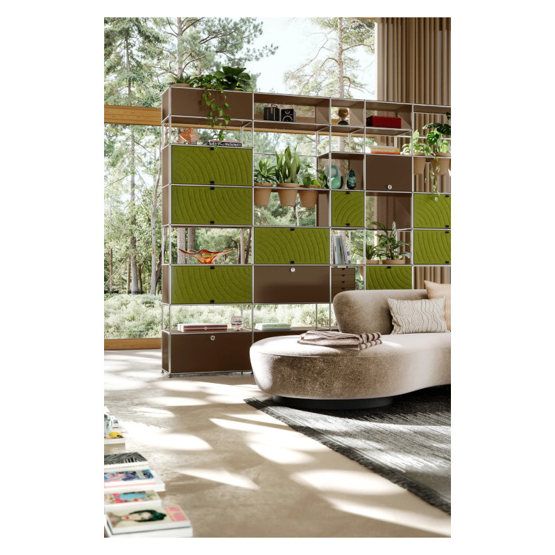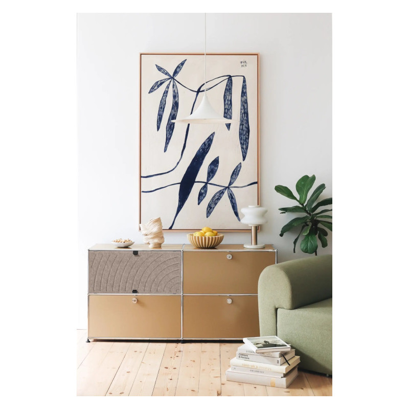 Les quatre Soft Panels* introduisent une dimension tactile et graphique particulièrement séduisante et originale. Conçus en textile et maintenus par un système d’aimants intégré, ils se clipsent aisément dans la structure sans outil ni fixation visible. Leur manipulation intuitive permet de les ouvrir vers le haut ou le bas, ou de les retourner selon les envies. Ce jeu de surfaces adoucit la rigueur du métal et enrichit l’esthétique globale du meuble.