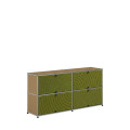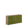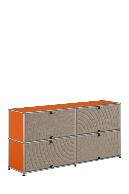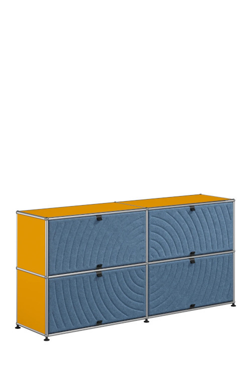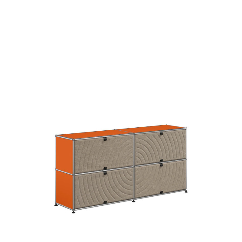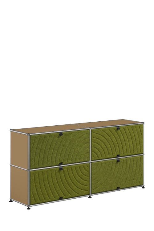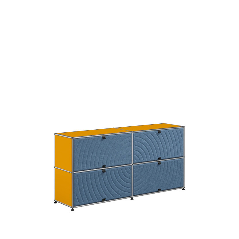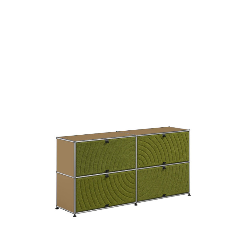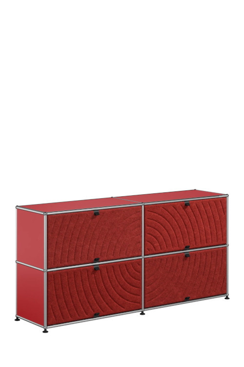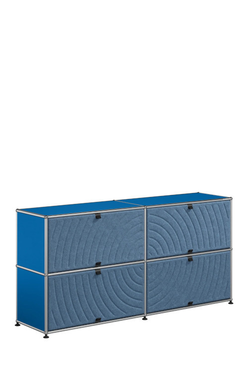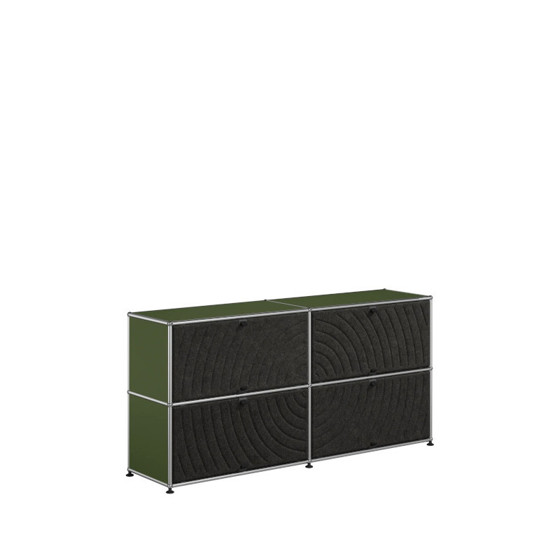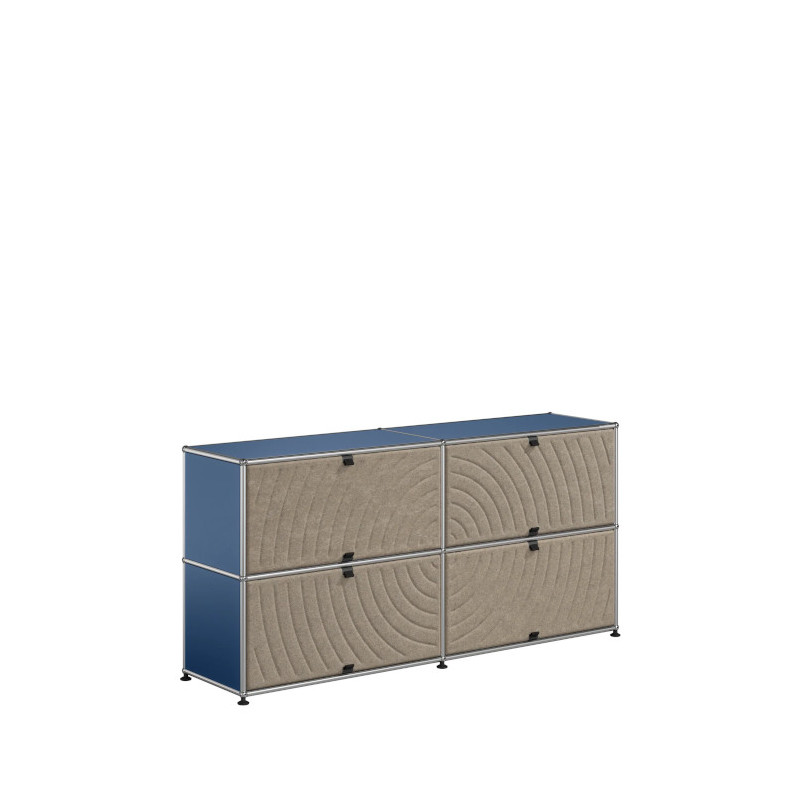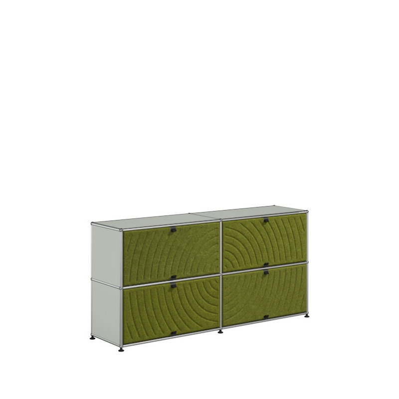 Les quatre Soft Panels* introduisent une dimension tactile et graphique particulièrement séduisante et originale. Conçus en textile et maintenus par un système d’aimants intégré, ils se clipsent aisément dans la structure sans outil ni fixation visible. Leur manipulation intuitive permet de les ouvrir vers le haut ou le bas, ou de les retourner selon les envies. Ce jeu de surfaces adoucit la rigueur du métal et enrichit l’esthétique globale du meuble.